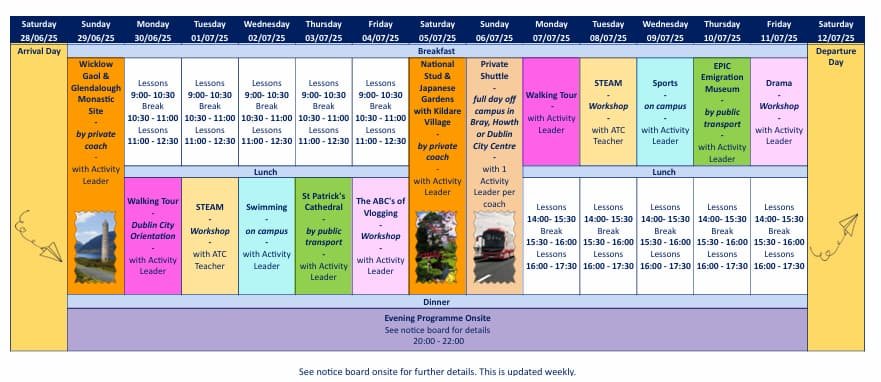 Participaràs en tallers temàtics, activitats esportives, artístiques o científiques, i excursions que et permetran conèixer Irlanda mentre fas nous amics d’arreu del món.