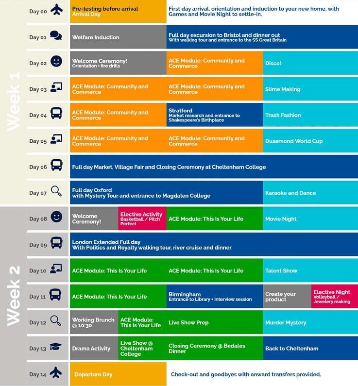 Els professors imparteixen classes en anglès basades en les competències i excursions. Les classes de lideratge són al matí i per equips, i per la tarda hi ha les sessions per parlar de les excursions i visites culturals.